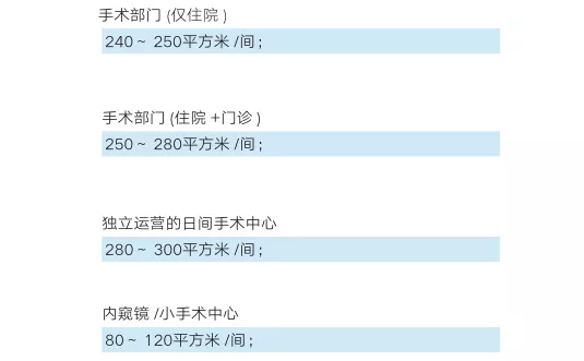 随着住院患者的增加,各种手术设备引入,上述面积指标已经很难满足手术空间的需求。翻阅美国在行业实践中的相关资料,《医院与门诊设施设计与建造导则》中对各类手术室的面积提出了更加合理的参照标准。