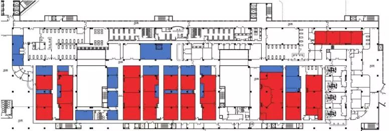 ▲HKS 于 2015 年设计的克拉玛依中心医院手术中心。集中布置的蓝色存储空间主要沿手术区的主干道布置,方便对 PACU、手术室、麻醉工作室统一调配管理。同时在洁净走道若干个手术室中间穿插布置小的存储空间,方便医护人员及时便捷地存取物品。