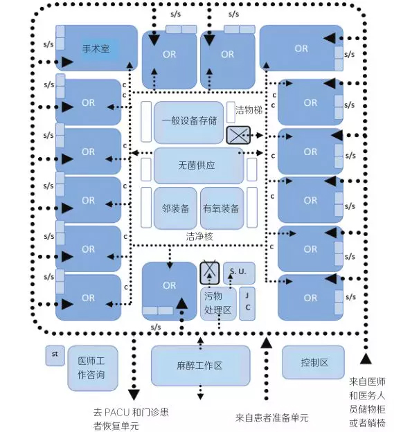 手术室前单走廊和带前室一般结合采用,其所遵循的是“污物不扩散”原则,将手术的污染物即时就地打包处理,污染不出手术室。手术室前后双走廊和纵横多走廊所遵循的是“防止交叉感染”的原则,将手术使用后的器材、废弃物,由外走廊送出,其他器材、医生、患者,则全部由内走廊出入。中心岛布局基于手术感染是以“接触感染”为主的观点,优先设置洁净手术器械、敷料,由中央洁净核供应,其他流线放在其次通过外围走廊进出。