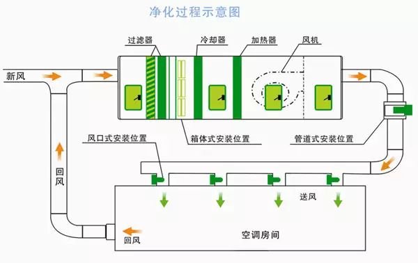 在医疗净化工程中,洁净手术室的通常空气净化流程是:气流→初效过滤器→加湿段→加热段→表冷段→中效过滤器→风机送风→管道→高效空气过滤器→风口→层流送风天花→吹入屋内→带走尘埃细菌等颗粒→ 回风百叶窗→初效过滤器。多次重复上面全过程,就能做到空气净化效果。如下图所示简洁明了而言,室外室内空气通过空气过滤器,去除室内空气中尘粒、细菌、病毒等,做到洁净标准,通过冷却、加湿然后,由风机吹送到管道,接受亚高效过滤空气净化风口的再次过滤器,然后吹入屋内,带走尘埃细菌等颗粒,污染空气利用回风口排出。