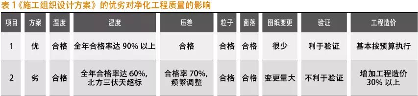 《施工组织设计方案》是建设和指导工程项目施工的重要技术经济文件,其优劣不仅直接影响到工程质量,对工期及施工过程中的施工安全也有着重要影响。良好的《施工组织设计方案》能调节施工中人员、机器、材料、环境、工艺、设备、管道、土建、安装、管理等之间发生的矛盾。制药企业对《施工组织设计方案》进行有效地监督和控制,才能保证工程项目高质量、低成本的完成,同时也对洁净厂房的验证提供必要的指导。《施工组织设计方案》的优劣对净化工程质量的影响见表1。