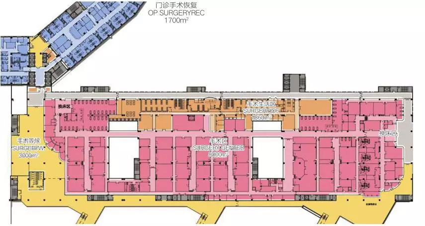 ▲HKS 于 2015 年设计的克拉玛依中心医院手术中心平面图。手术等候大厅(亮黄色区域)位于医疗街公共区域靠近住院部(蓝色区域)交通核,方便从住院病房护送患者下来的陪护家属在换床区域前等候。手术生活区(橘黄色区域)位于手术中心的外围紧贴内部医护走廊(灰色区域),保证了医护人员与公共人流的分离。术前准备与术后恢复同样在内部医护走廊设置单独的出入口,方便转运手术患者的同时保护患者的隐私。剩余区域为手术室及无菌物品的存储空间(红色区域)。
