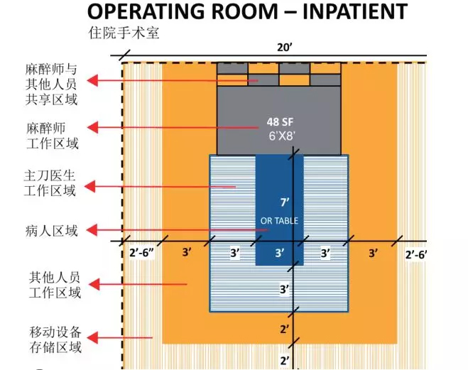 <img src="images/DB0C25CA-2604E6B9-6A121A11-59842D620.jpg" alt="" /> 比如,在前述的手术室面积区域图中,其他工作人员一般不得进入主刀医生工作区域。与嵌入式安装器械柜等设备不同,美国多采用独立可移动的形式布置在房间外围,因此在相同的柱距下可获得更多的净面积。