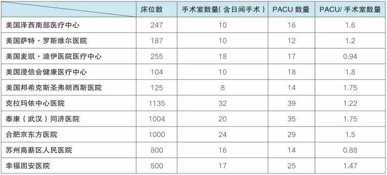 手术生活区、麻醉后护理单位 PACU、手术室、无菌物品(含设备)存放空间对比