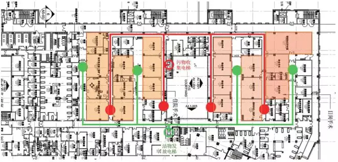国内洁净手术部普遍采用的是洁污双走廊的形式,这种形式最大的特点就是洁污分隔,洁净物品通道和污物收集通道相互交错完全分隔,医务人员、患者和洁净敷料从洁净通道(绿色)进入手术室,术后器材与废弃物从污物通道(红色)送出。洁净通道设置有连接中央供应发放区的洁梯和连接血库的小电梯或窗口。污物通道有连接中央供应收集区的污梯和病理科的小电梯。这种形式洁污明晰,感控上也容易过关,已被大多数医护、工程技术人员接受。