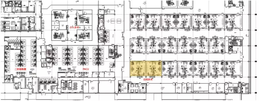 合肥京东方医院日间手术室设置在手术中心区域内,介入手术室与手术中心共享麻醉恢复设施,日间手术室设计了专门的二阶段恢复床位。整个麻醉恢复区域靠近医疗街,方便当日预约的患者前来接受手术。
