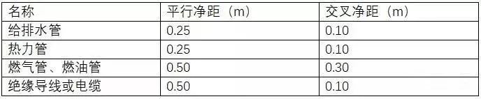 氧气管与其他管线之间距离应符合下表规定,当间距无法满足时,应采取安全可靠的技术措施。